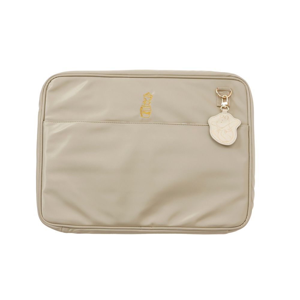 表面のフロント中央部分には、作中に登場する「プーさん」のお部屋の鳩時計の仕掛け部分が刺繍で施されており、ゴールドのプリントで表現された「プーさん」のチャームは取り外し可能です。更に内側には様々な表情の「プーさん」が総柄でプリントされています。外出先でPCリュックを開くたびに可愛らしい「プーさん」に出会うことができます。