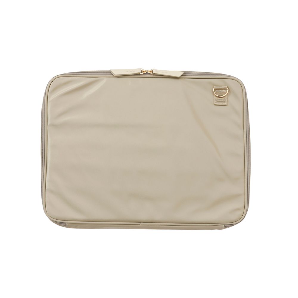 フロントポケットにはノートやマウスパッド、内側のメッシュポケットには、アダプタ、ノート、手帳、ペンなども整理して収納できます。さらに、PCを立てかけたままで使えるスタンド板がついており、作業効率もアップ。内側にはPC固定用のゴムが左右1箇所ずつ備わっており、大切なPCをしっかり固定し守ります。