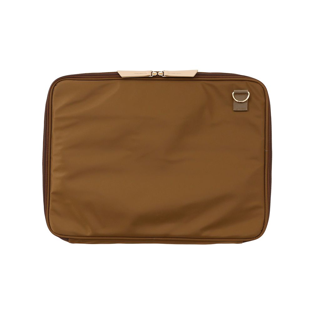 フロントポケットにはノートやマウスパッド、内側のメッシュポケットには、アダプタ、ノート、手帳、ペンなども整理して収納できます。さらに、PCを立てかけたままで使えるスタンド板がついており、作業効率もアップ。内側にはPC固定用のゴムが左右1箇所ずつ備わっており、大切なPCをしっかり固定し守ります。