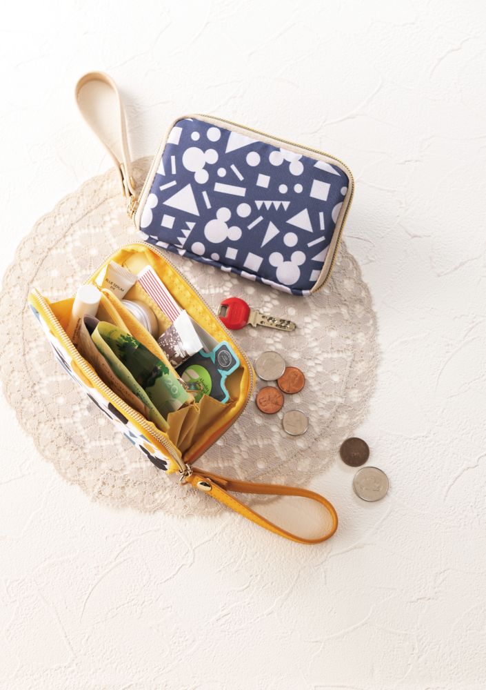 お札やカード、コインはもちろん、大きめのポケットにリップや鍵などの小物も入る収納力が自慢です。ミッキーシルエットの楽しい総柄に、ネイビーはバイカラーの中布も気分が上がる!かわいくて機能も◎なお財布ポーチです。