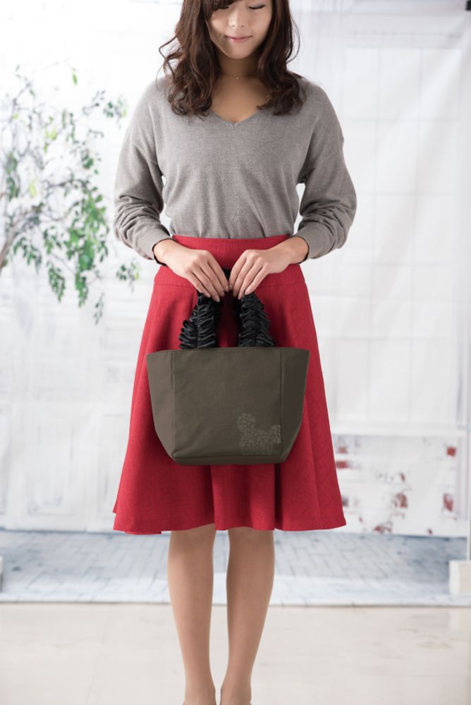 レディな気分を盛り上げるフリルと大人なモノトーンカラーが絶妙なトートバッグ。大き過ぎず、最低限の荷物が入るサイズ感もこだわりました。ミッキーシルエットがちょこんとプリントされたオリジナルデザインは、ここだけでしか手に入らないアイテムです。
