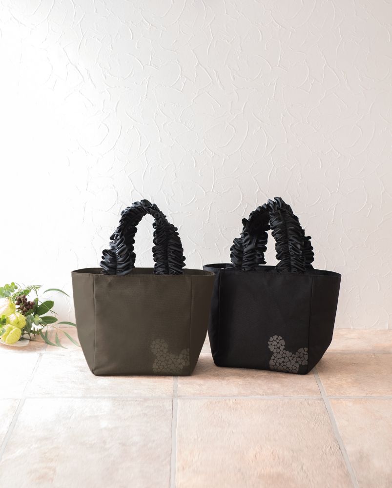 レディな気分を盛り上げるフリルと大人なモノトーンカラーが絶妙なトートバッグ。大き過ぎず、最低限の荷物が入るサイズ感もこだわりました。ミッキーシルエットがちょこんとプリントされたオリジナルデザインは、ここだけでしか手に入らないアイテムです。
