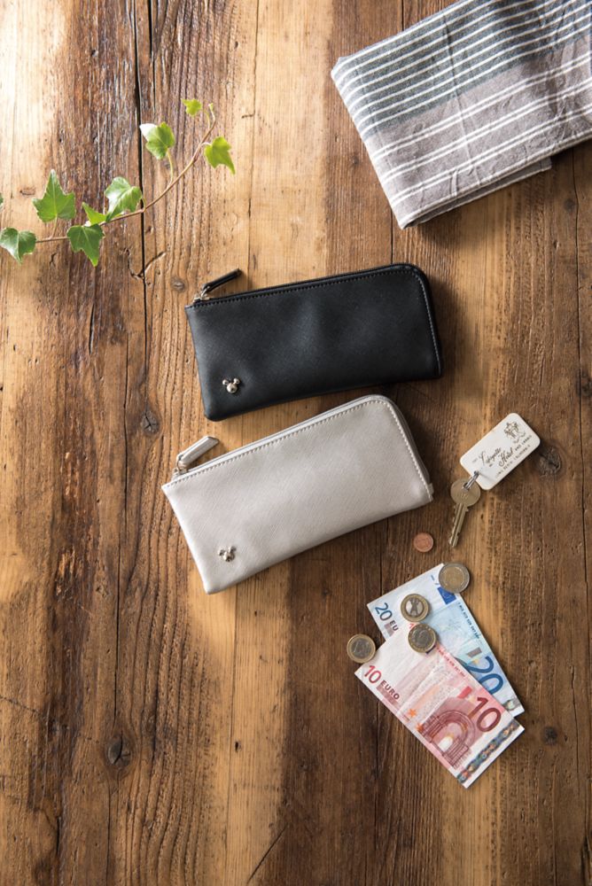 L字のラウンドファスナーで開閉する長財布。カード収納もたくさんあり、使いやすい形なのでデイリー使いに活躍します。ポイントにあしらったミッキー形の金具が控えめながらいいアクセントになっています。男女兼用でお使いいただけるカラーをご用意しました。