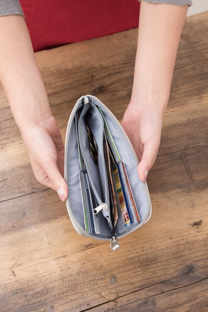 L字のラウンドファスナーで開閉する長財布。カード収納もたくさんあり、使いやすい形なのでデイリー使いに活躍します。ポイントにあしらったミッキー形の金具が控えめながらいいアクセントになっています。男女兼用でお使いいただけるカラーをご用意しました。