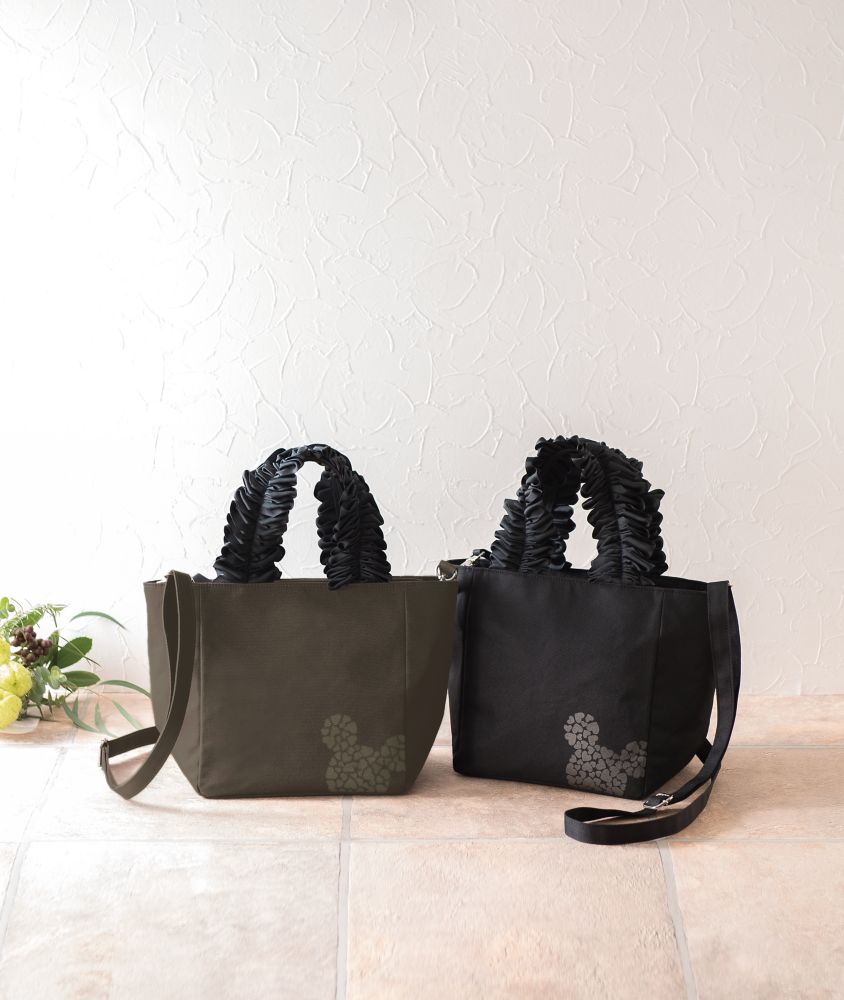 レディな気分を盛り上げるフリルと大人なモノトーンカラーが絶妙なトートバッグ。大き過ぎず、最低限の荷物が入るサイズ感、ショルダーベルト付きで2WAYで楽しめます。ミッキーシルエットがちょこんとプリントされたオリジナルデザインは、ここだけでしか手に入らないアイテムです。