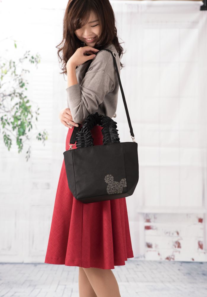レディな気分を盛り上げるフリルと大人なモノトーンカラーが絶妙なトートバッグ。大き過ぎず、最低限の荷物が入るサイズ感、ショルダーベルト付きで2WAYで楽しめます。ミッキーシルエットがちょこんとプリントされたオリジナルデザインは、ここだけでしか手に入らないアイテムです。