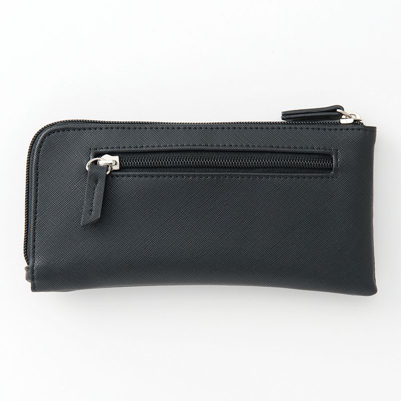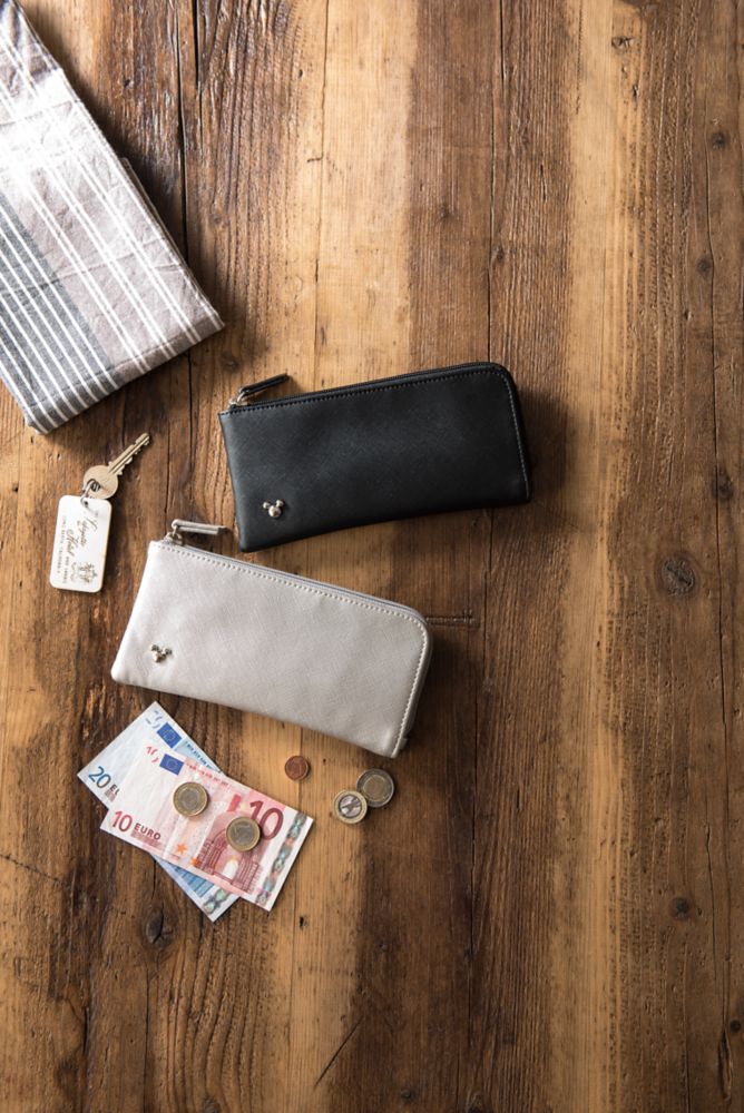 L字のラウンドファスナーで開閉する長財布。カード収納もたくさんあり、使いやすい形なのでデイリー使いに活躍します。ポイントにあしらったミッキー形の金具が控えめながらいいアクセントになっています。男女兼用でお使いいただけるカラーをご用意しました。