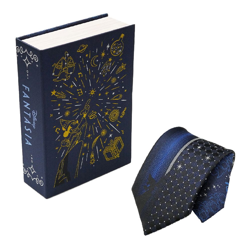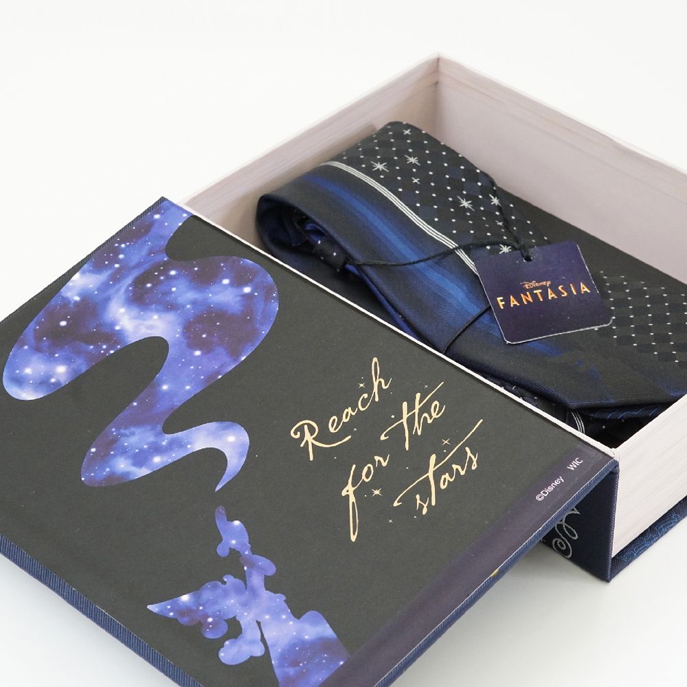 ☆Disney Character Design Tie☆ディズニーの長編アニメーション映画『ファンタジア』の幻想的な世界観を、上質なジャガード織で表現したキャラクターネクタイ。大剣部分には「魔法使いの弟子」に扮したミッキーが描かれ、魔法の軌跡が華やかに舞うデザインが印象的です。裏側の小剣には、ミッキーと魔法のほうきのシルエットがさりげなく施され、遊び心のある仕上がりに。ネクタイは、物語をイメージした特製ブック型BOXに収めてお届け。表紙にはミッキーが魔法を放つ姿と星や楽譜などのモチーフが散りばめられ、まるで本を開くようなワクワク感を演出します。日常使いはもちろん、『ファンタジア』ファンやディズニー好きへのギフトにも最適なアイテムです。