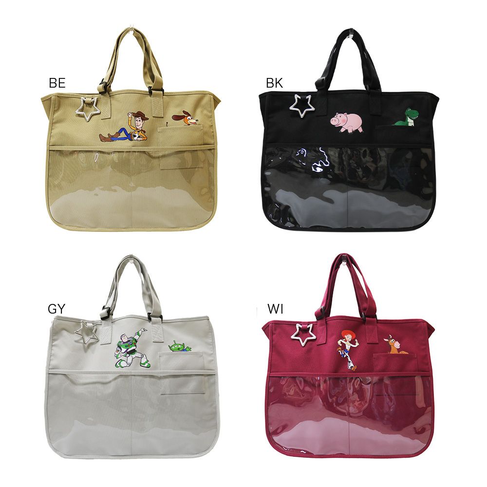 前回大人気で即完売した、マルチポケットトートの新作。 素材をより軽いポリエステルに、前面ポケットをPVCに変更し、より使いやすい仕様にアップデート。 ポケットから覗くキャラクターと特徴的なポーズがアクセントに。大容量かつポケットがたくさんついていて、推し活やテーマパークにぴったりなバッグ。 ぬいぐるみや、お土産もしっかり入るサイズ感。 持ち手は長さ調節可能で、肩掛け・手持ちどちらでも持つことができ長時間の持ち歩きに便利。内側のポケットにはレジャーシートや折りたたみの椅子が収納できる大きなポケットとペットボトルホルダーポケット付き。 外側にはスマホのカメラ部分が覗く深さのポケットが付いており、撮影にも便利。(※1) PVCポケット部分は、見せポケットとしてカチューシャやお気に入りのアイテムを入れて、アレンジできるデザイン。 星形のカラビナには、キーホルダーやポーチを付けてお好みでカスタマイズ可能。