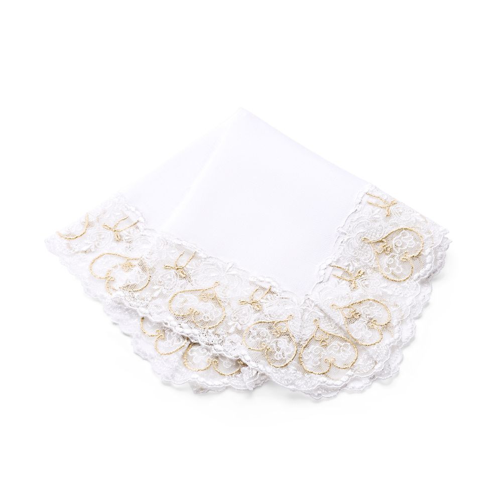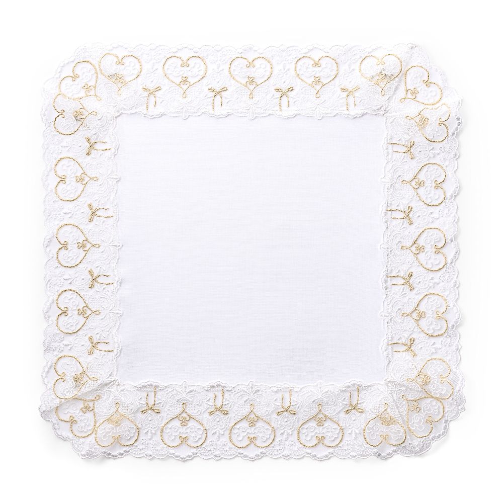 オリジナルレースを贅沢にあしらったブライダルハンカチ。仲良く向かい合うミッキーとミニーに特別な日の想いをこめて。