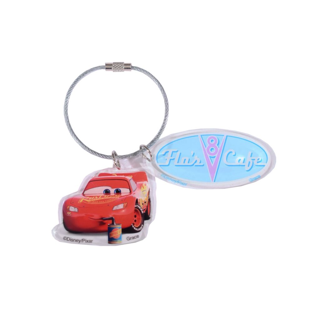 こちらはエネルギー補給中の「ライトニング・マックィーン」と「Flo'sV8 Cafe」のロゴがデザインされた2連アクリルチャームです。