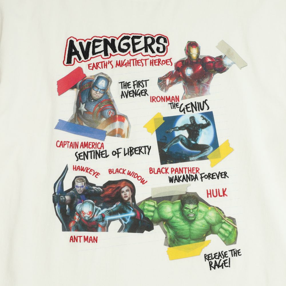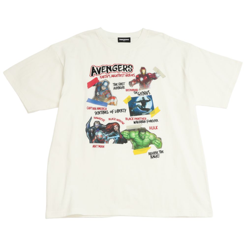ステッカー風の「アイアンマン」「キャプテン・アメリカ」「ブラックパンサー」「アントマン」「ホークアイ」「ブラック・ウィドウ」「ハルク」と刺繍ロゴがかわいいがデザインされたTシャツです。