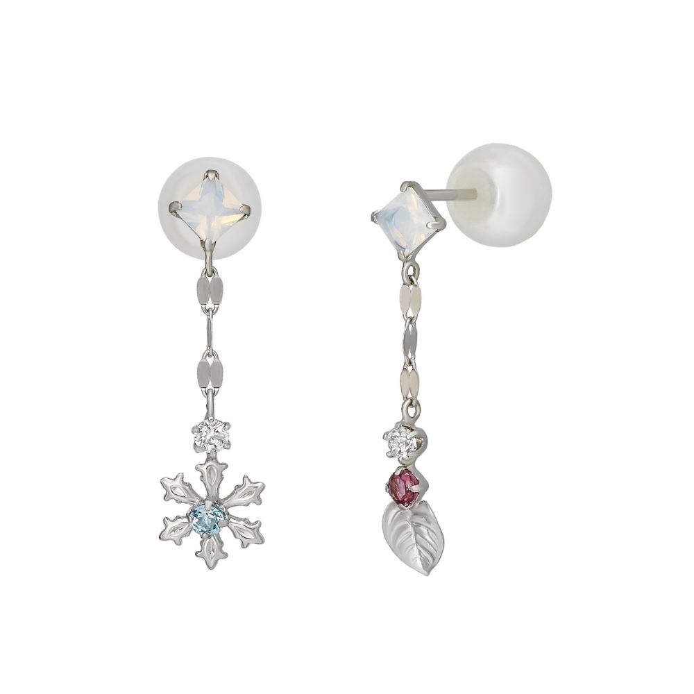 K10ホワイトゴールド( ポストとキャッチ部分のみK14ホワイトゴールド)、ガラスオパール、キュービックジルコニア(クリア)、スイスブルートパーズ、ロードライトガーネット、プラスチックパールキャッチ(ホワイト