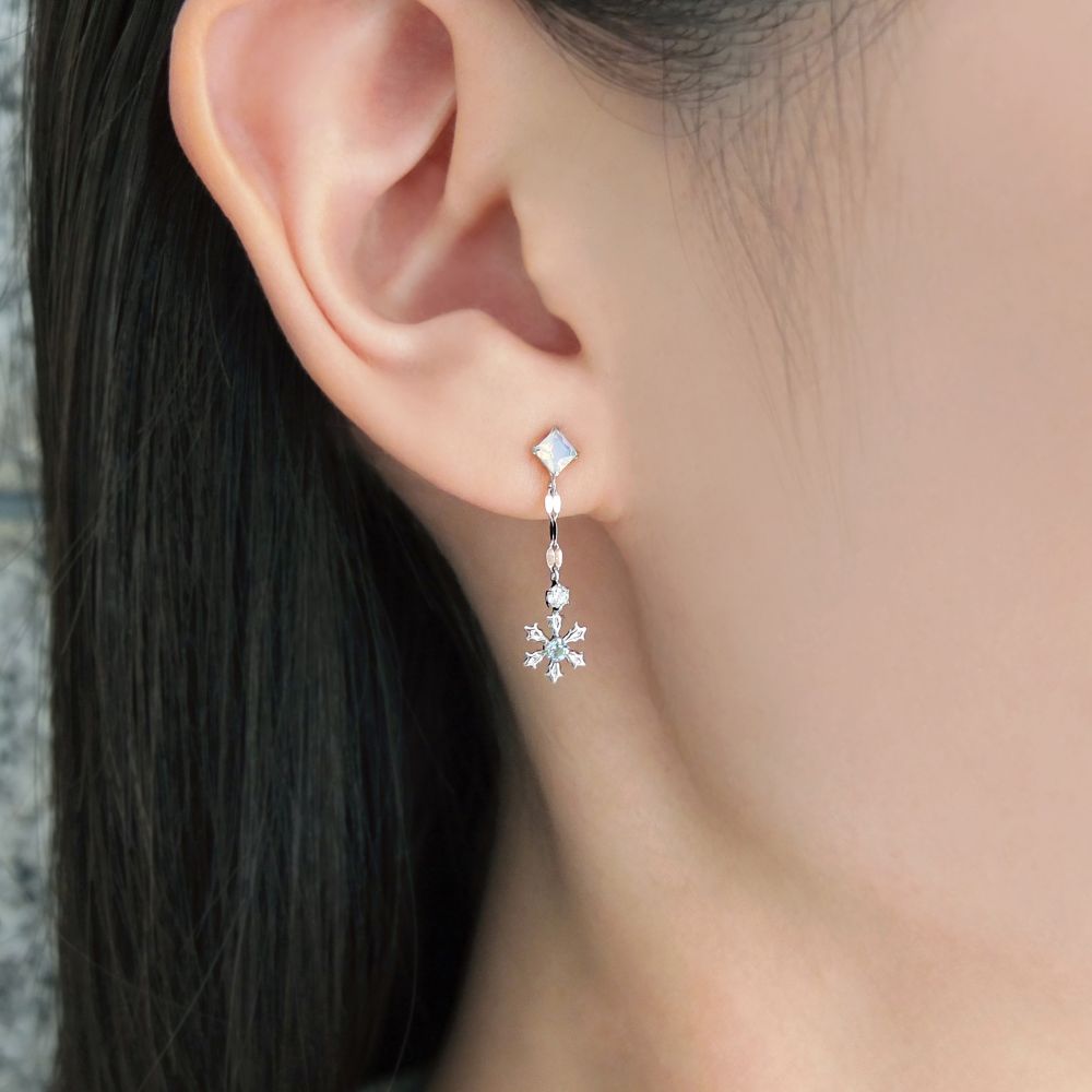 雪の結晶とブルートパーズでエルサ、葉っぱのモチーフとロードライトガーネットでアナを表現しました。キラキラとデザインチェーンが輝きアシンメトリーでおしゃれなピアスです。