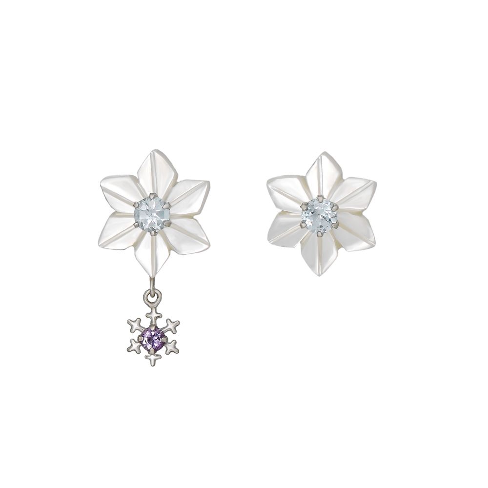 K10ホワイトゴールド( ポスト、キャッチ部分のみK14ホワイトゴールド)、ホワイトシェル、ブルートパーズ、ライトアメジスト