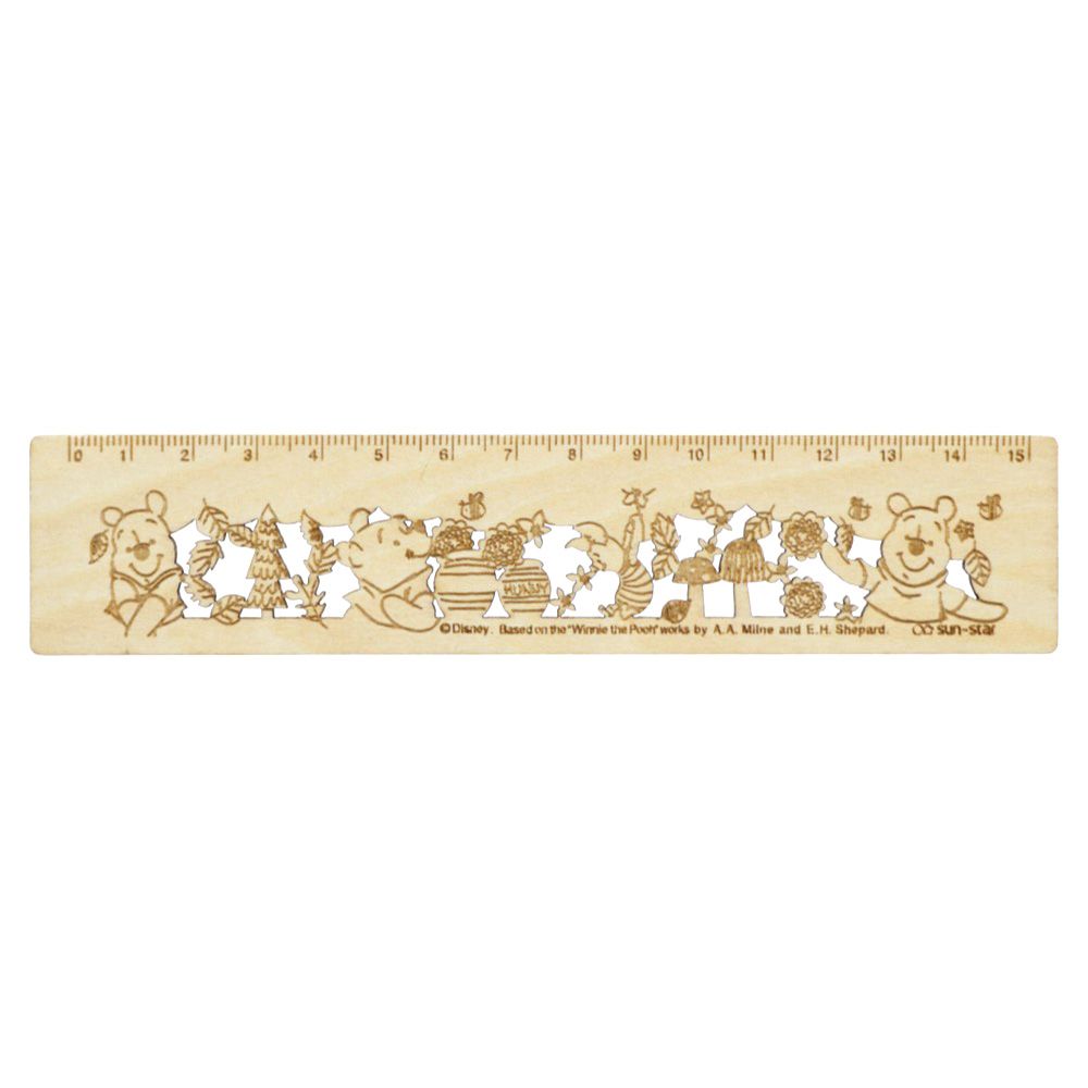 15cmの、「木製定規」。 柄は、くまのプーさん。 様々なポーズのプーさんと、ピグレットとキノコやハチミツなどのアイテムが可愛いデザイン。