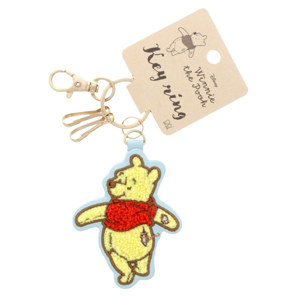 鍵をつけるのはもちろん、バッグにつけてチャームとしても可愛い、「サガラ刺繍キーリング」。 柄は、くまのプーさん。 継ぎ目がほつれているプーさんのデザイン。