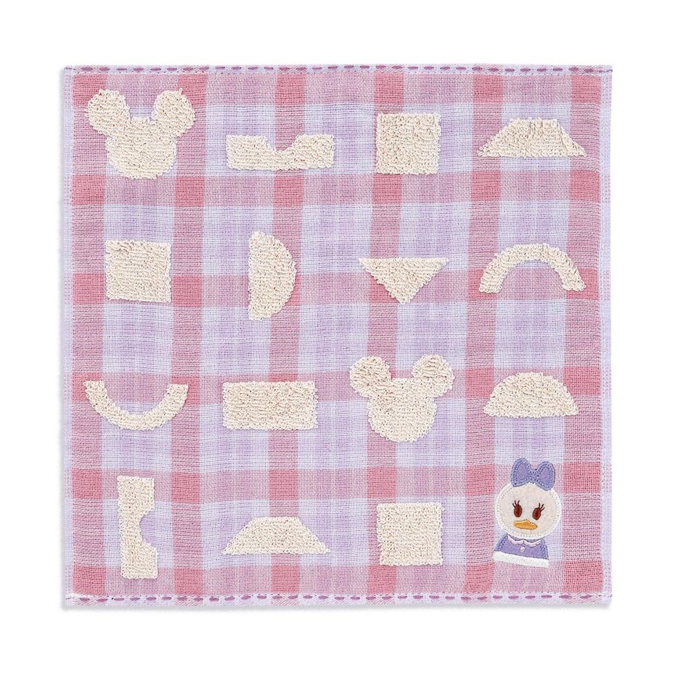 いろんな向きの積み木が並ぶかわいいミニタオル。どの柄がどの積み木と同じ形かな?