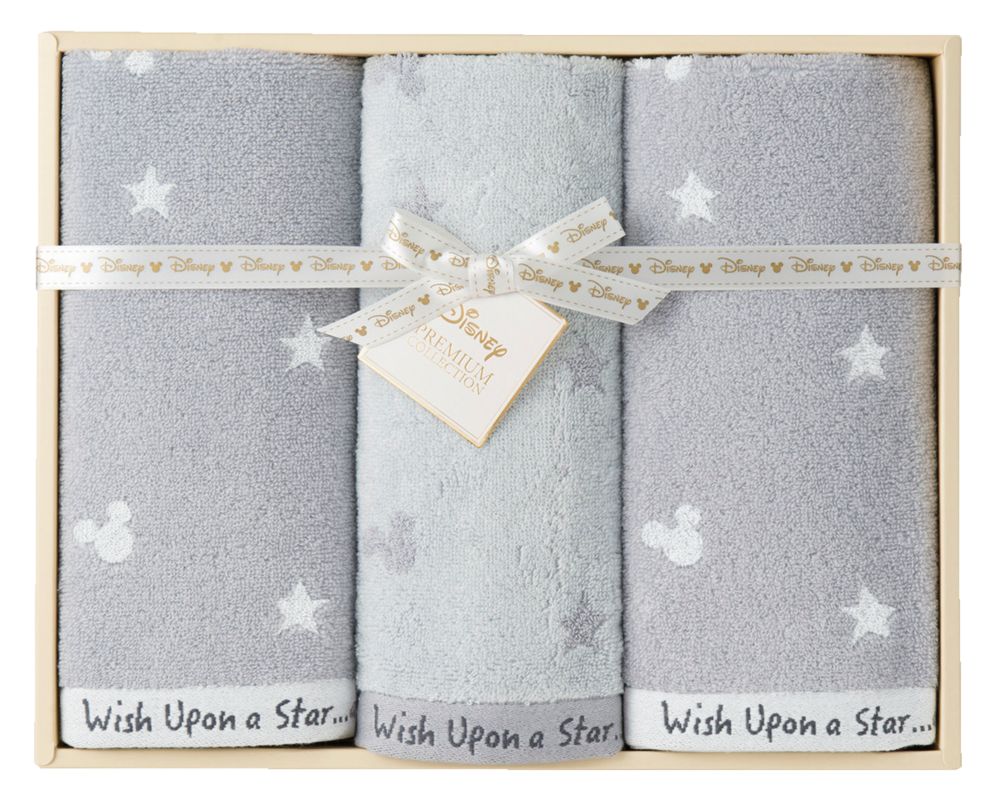 素材・デザインにこだわったプレミアムなタオル。無撚糸を使用しふわふわな肌触りに仕上げました。星柄に見え隠れするミッキーが大人かわいいタオルギフトです。