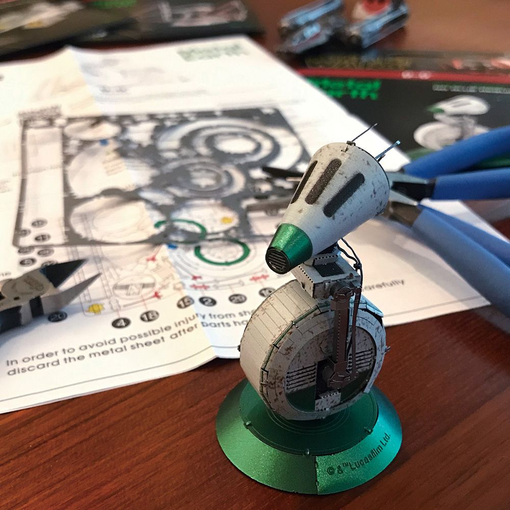 レーザーの超細密加工によるハイクオリティーメタルモデル「メタリックナノパズル マルチカラー シリーズ」にスター・ウォーズの『D-O』が登場!!メタルシートからパーツを取り外し、ペーパークラフトのように曲げたり、折ったり、差し込んでいくと、『D-O』が完成します。