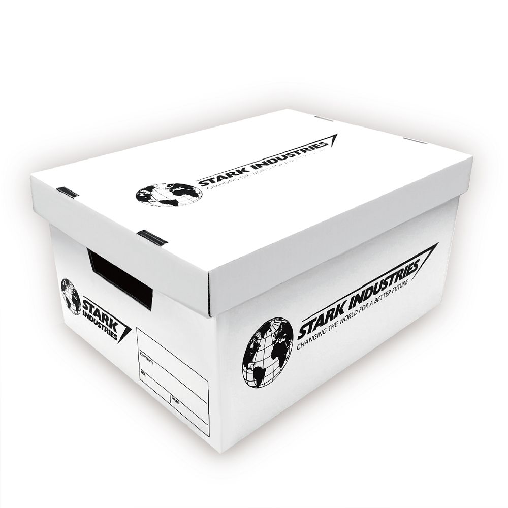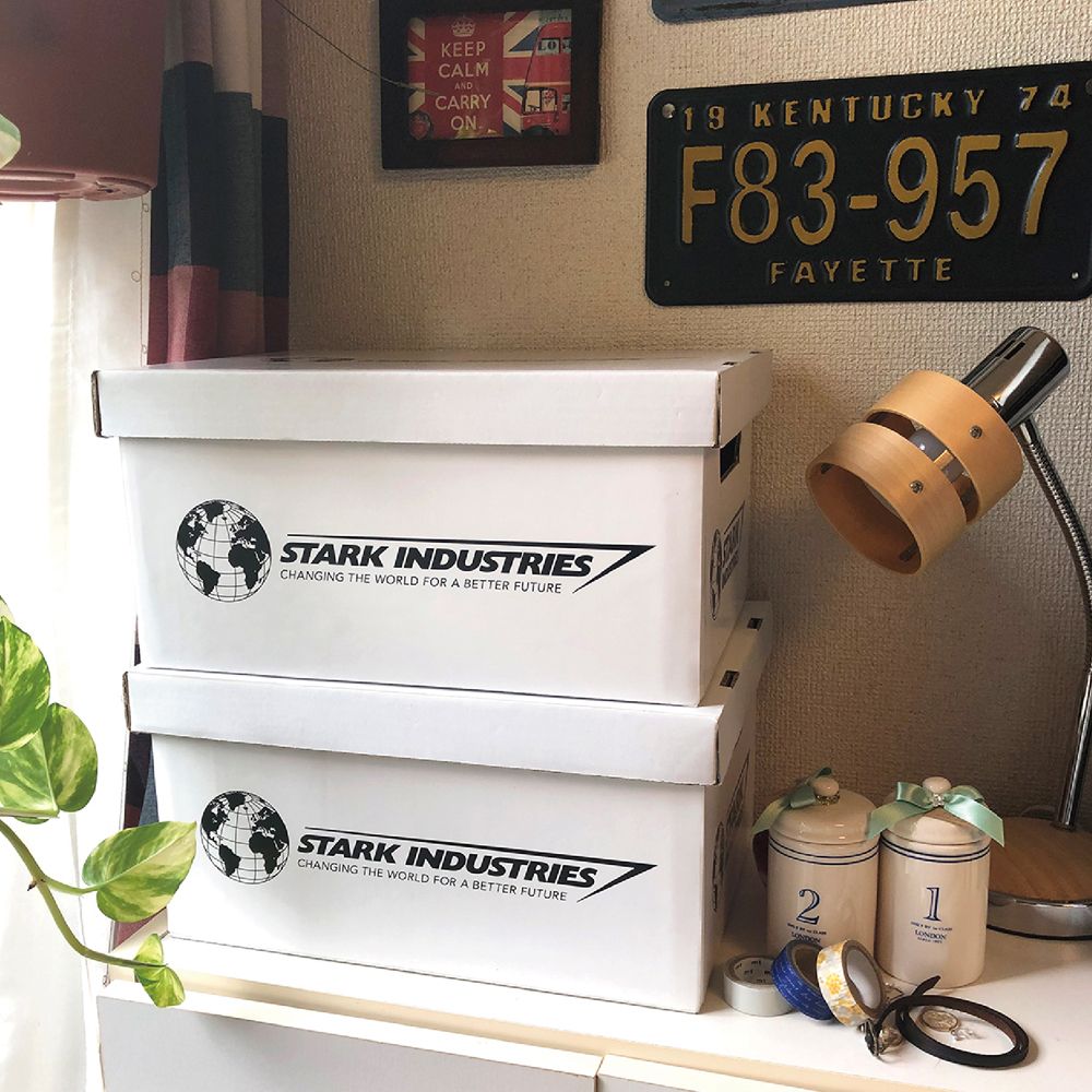 トニー・スターク率いる「スターク・インダストリーズ」のクールなロゴがデザインされたストレージボックスです。お気に入りのスニーカーやマンガ単行本、 A4ファイル、もちろんマーベルコミックスもぴったりスッキリ収納可能。側面にタイトルや日付、ボックスナンバーなどがさりげなく記入できちゃうスペースもあるので、何を収納していたかも一目でわかるスグレモノ!複数揃えて収納すれば、あなたのお部屋もまるでスターク・インダストリーズのオフィスのよう!?