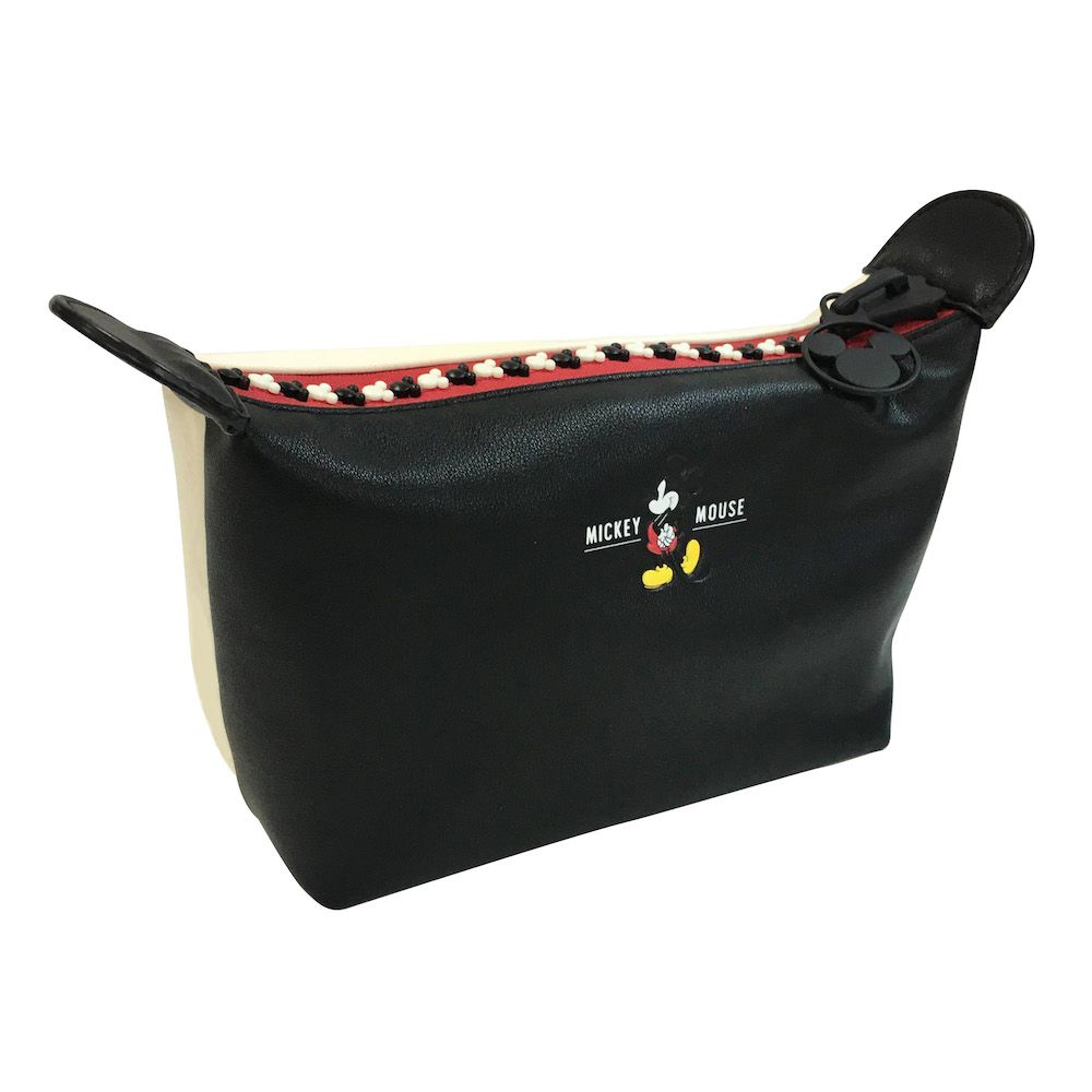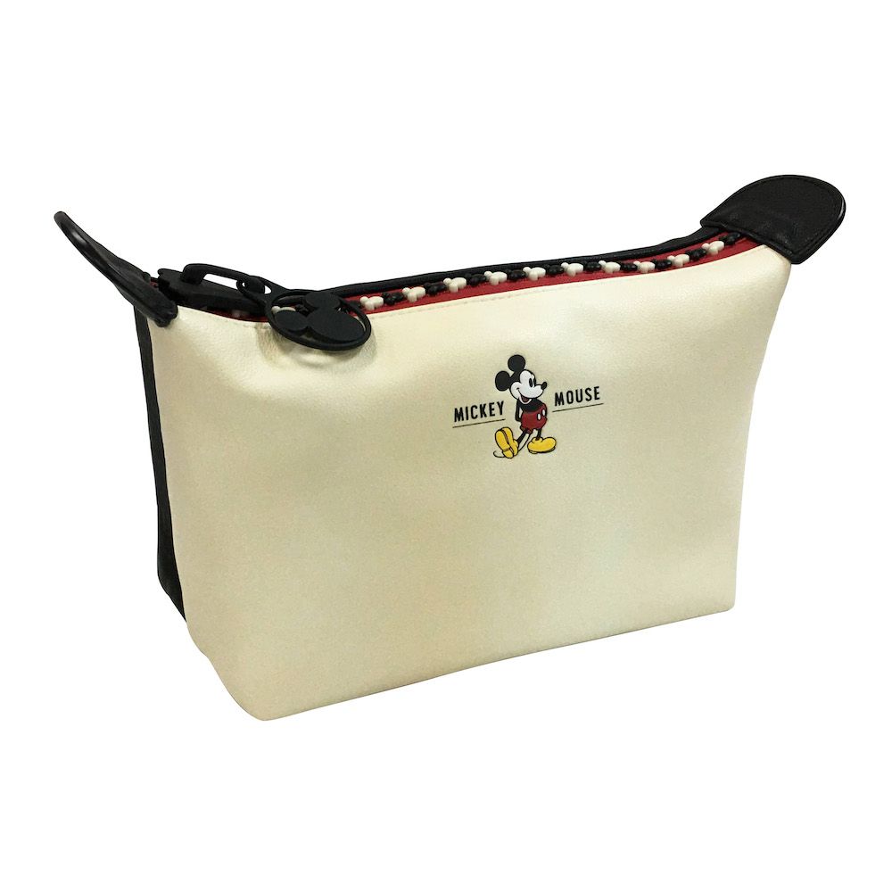 世界初!ひとつひとつがミッキーのカタチの超ユニークなデザインのジッパーができました!!ポーチ本体はオフホワイト/ブラックのレザー調生地に立体感のあるエンボス加工でプリントされたミッキー がワンポイント!つい見せびらかしたくなっちゃう!目立つこと間違いなしのミッキー愛溢れるアイテムです!!