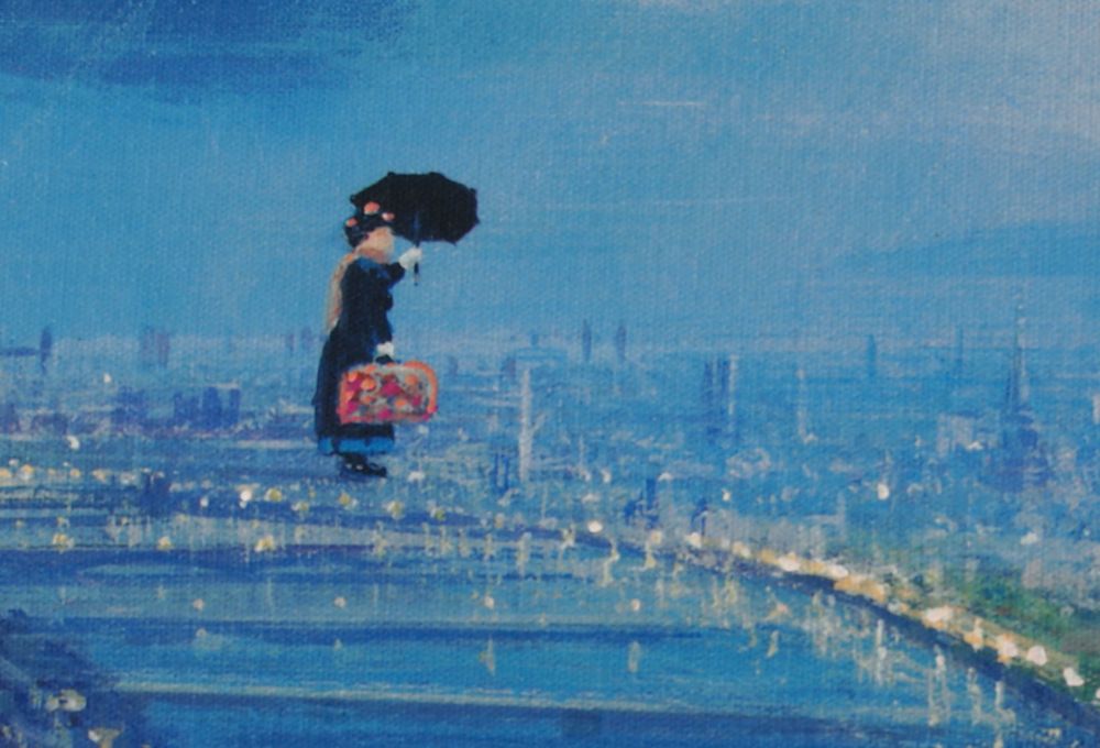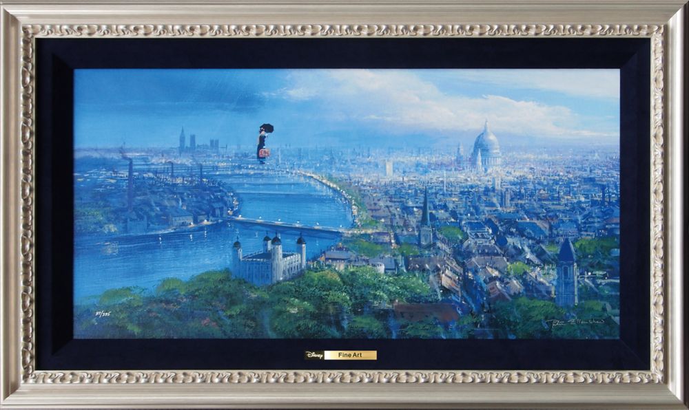 魔法使いのメリーポピンズがロンドンの上空を移動しています。朝日に照らされるセントポール大聖堂、街を堂々と流れるテムズ川、産業革命時代を思わせる煙突の数々など、ロンドンの美しい街並みを一望できる広大なスケールで描かれています。