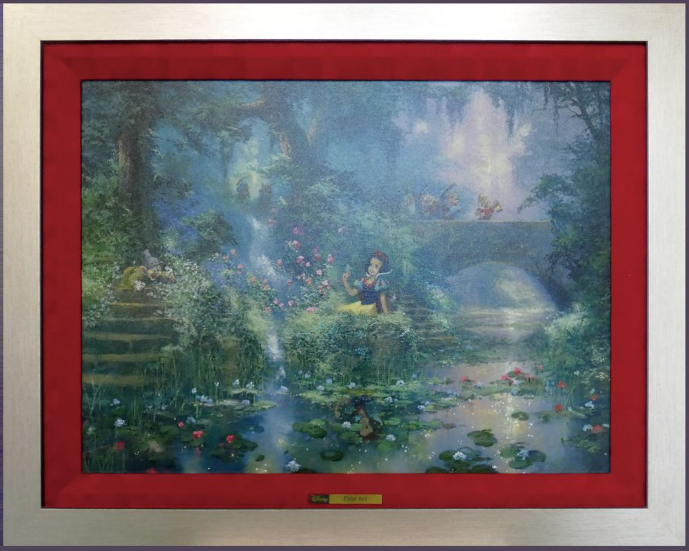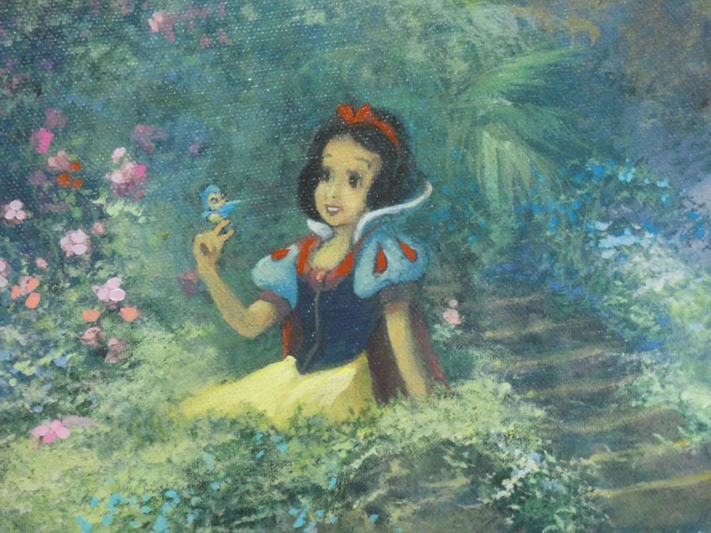 でもよく見ると、みんなの列から離れてドーピー(おとぼけ)が楽しそうにお花を摘んでいます。白雪姫は小川の畔に腰掛けて、小鳥さんと楽しくお話ししています。