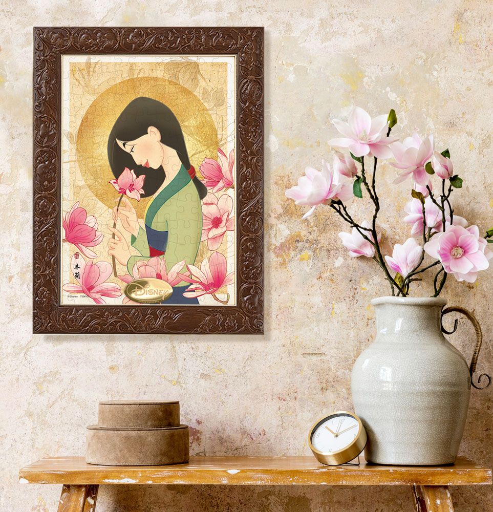 チャイニーズスタイルのムーランのジグソーパズルです。中国絵画のような筆のタッチは、正義感が強く凛としたムーランの内面をより際立たせ、その仕草や表情はいつもより大人っぽく描かれています。よりインテリアとしてお部屋に飾りたい絵柄のジグソーパズルです。
