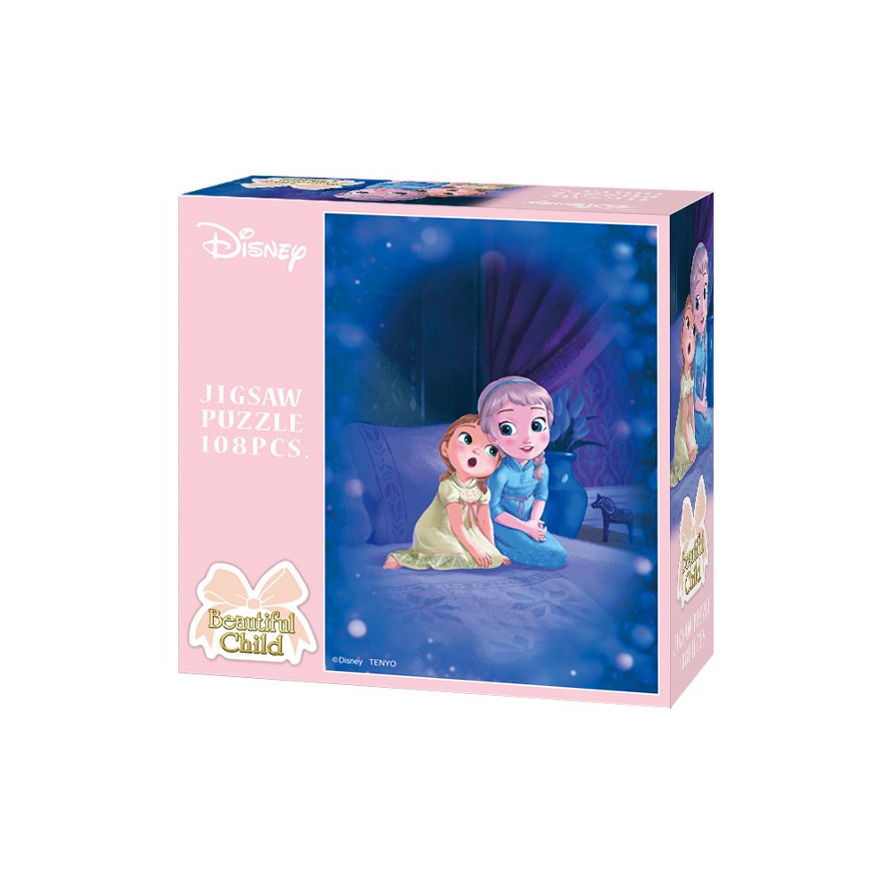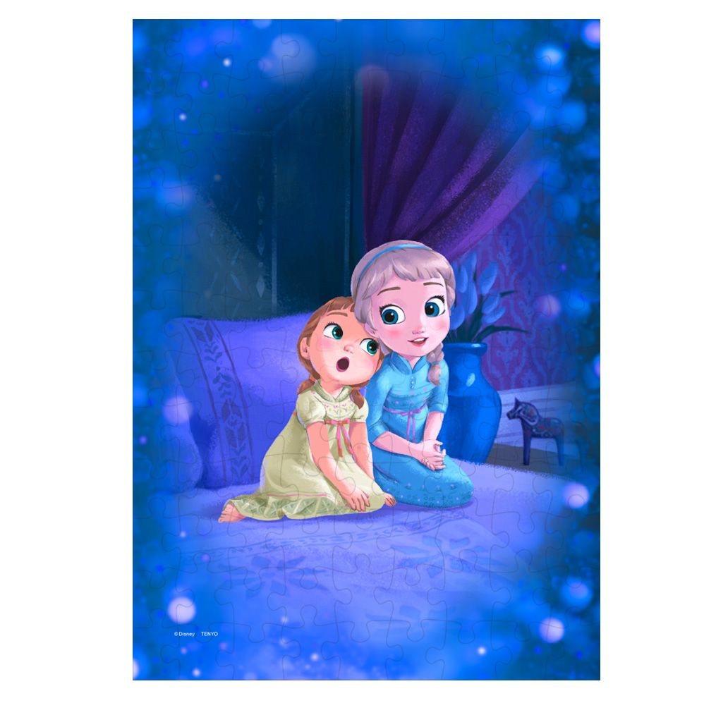 アレンデール王国のプリンセスとして皆に愛され幸せに暮らしていた幼い頃のエルサとアナ。大きなベッドの上で、国王でもある父親のお話しを聞いているときのあどけない二人の姿です。ちなみに、この絵柄は2019年に公開された『アナと雪の女王2』の場面を参考に描いています。