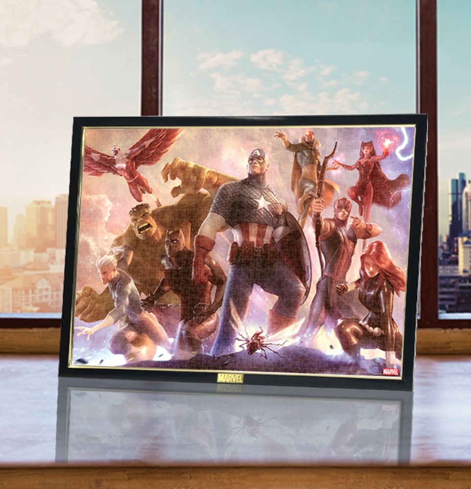 この作品は、「Avengers Team Iron Man」との連作であり、キャプテン・アメリカとアイアンマンそれぞれが率いるヒーローたちが相対する、劇的な構図となっています。強い決意をもって中央に立つキャプテン・アメリカと、それを支えるヒーローたちの熱い表情を、スペシャルアートならではの迫力あふれるタッチで描いています。ピースが純白で、発色が美しく、ピタッとはまるフィット感が魅力の〈ピュアホワイト・ジグソーパズル〉です。さらにぎゅっとサイズシリーズは、通常よりひと回り小さいピースで、コンパクトなスペースでもたっぷりと本格的なジグソーパズルが楽しめます。パズル完成後、別売の専用パネルに入れて飾れば、お部屋を彩るステキなインテリアに!