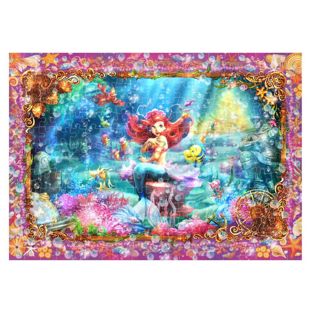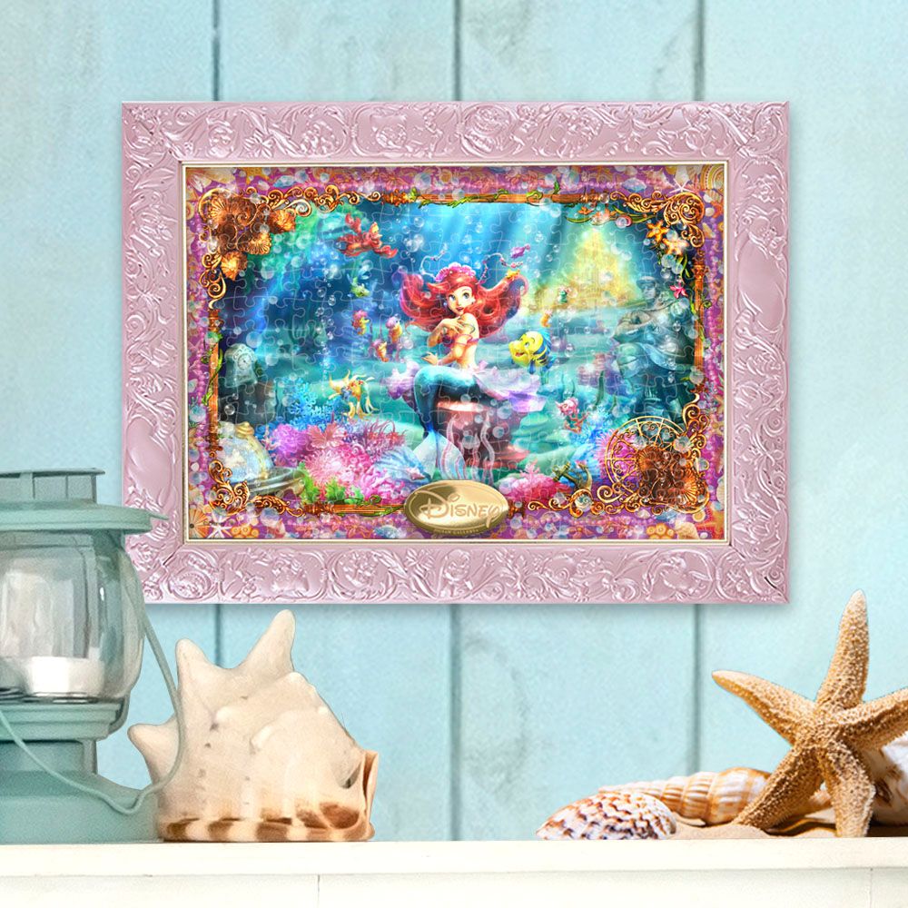 ここは、アリエルの暮らす海の中。陸にいるエリック王子にいつも想いを募らせています。恋するマーメイド、キラキラの美しいアリエル。絵柄のゴージャスな枠は、アンティークの家具、工芸品などに使われている海のモチーフをデザインした「ロカイユ装飾」というものです。