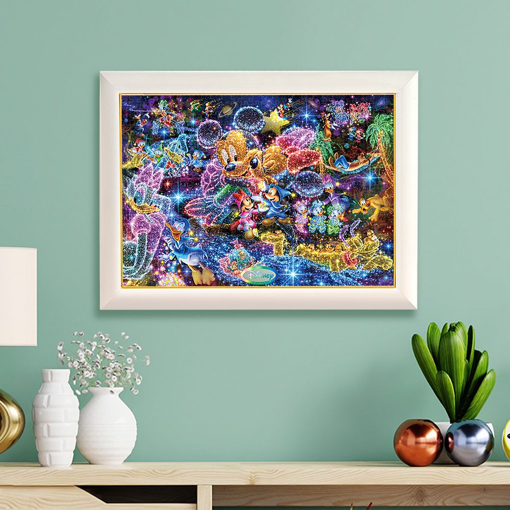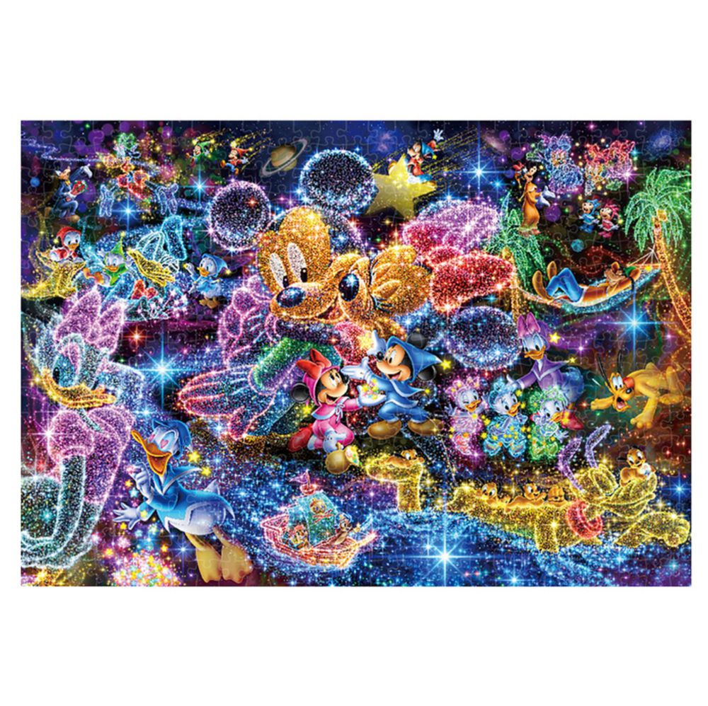ミッキー、ミニーたちが、夜空の星を使って自分の「夢」「理想」「希望」を描いています。好きな人にプロポーズ、ファッションショーのランウェイ、アイドルになってうたを歌うなど、想いはさまざま。おやおや…?南の島でハンモックにゆられているキャラクターもいますよ!パズル完成後、別売の専用パネルに入れて飾れば、お部屋を彩るステキなインテリアに!ぎゅっとサイズシリーズは、通常よりひと回り小さいピースで、コンパクトなスペースでもたっぷりと本格的なジグソーパズルが楽しめます。