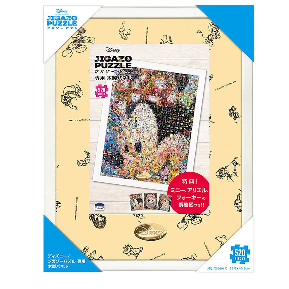 完成したジガソーパズルをこのパネルに入れて飾れば、見た目も組み上げた喜びも一層アップ♪シンプルなデザインで、どんなお部屋にもぴったり!さらに、特典のキャラクター解答図(ミニーマウス、アリエル、フォーキー)、Disneyのエンブレム・プレート付き。