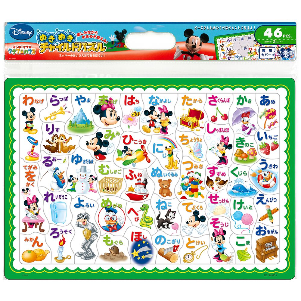 ミッキーたちの絵柄で楽しく遊んでいるうちに、自然にひらがなに親しむことがでできるパズルです。
