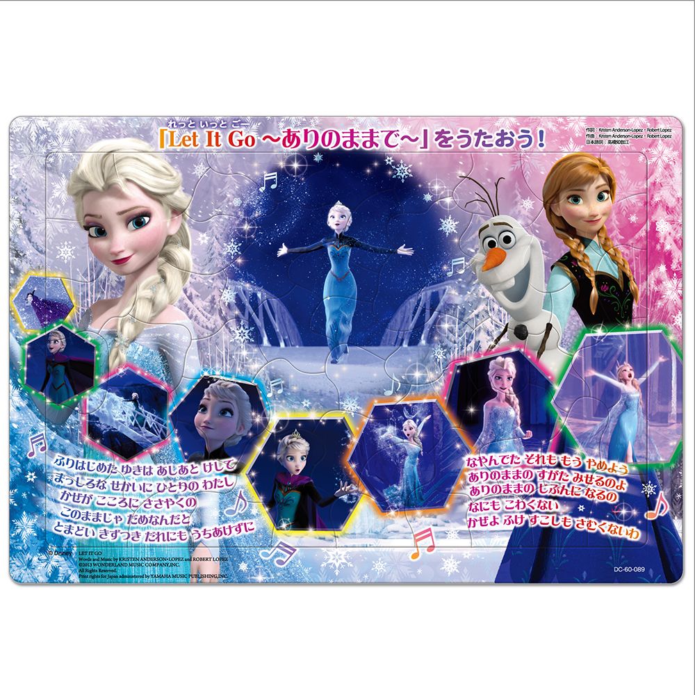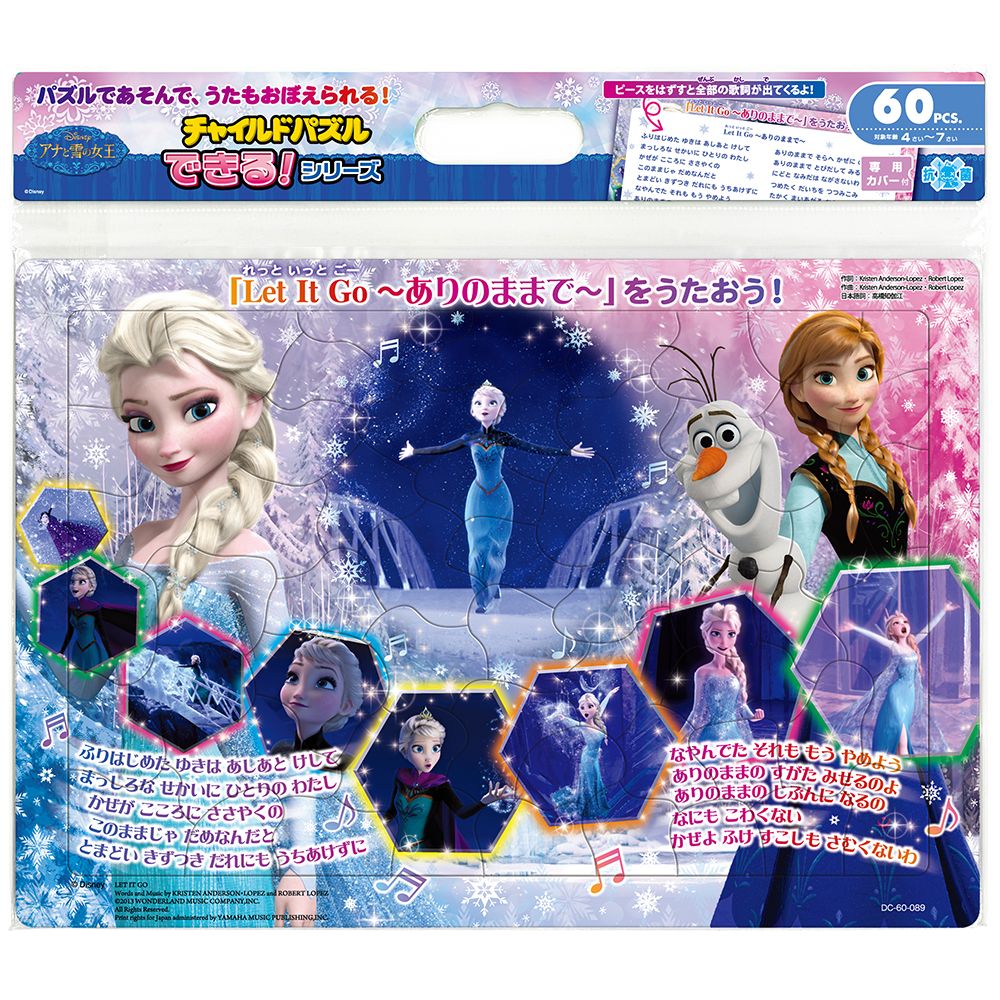 ピースやパズルの台紙を使って、パズル以外の遊びもできる!パズルです。「Let It Go」の流れるシーンと歌詞が一緒になった、歌も楽しむことができるパズルです。ピースの下には歌詞がフルコーラスで書かれています!
