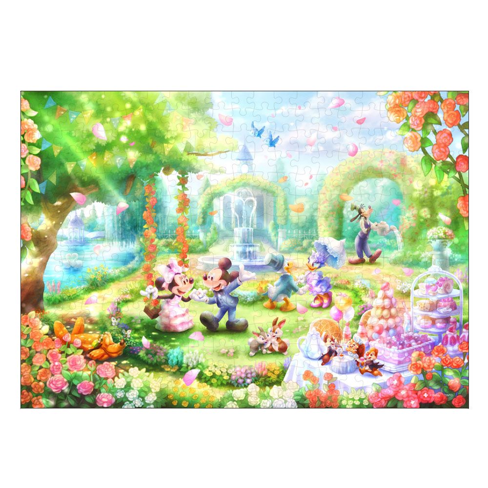 バラが美しく咲き誇るステキなお庭で、優雅にガーデンパーティーを楽しんでいます!ミッキーはブランコに揺られていたミニーをやさしくエスコートしています。いつも元気いっぱいで陽気なグーフィーも庭師になりきって珍しくおすましモード?!