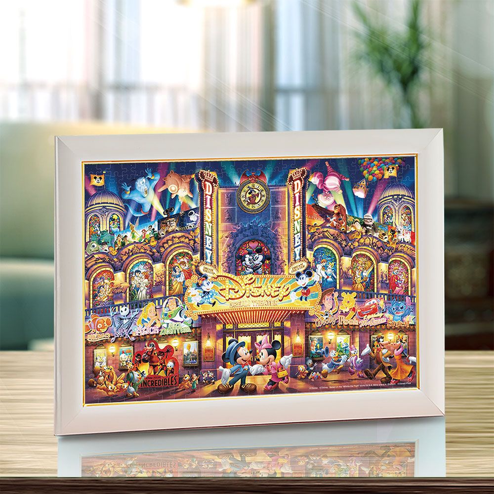 ネオンがまたたき、数々のディズニーの名作映画の看板が街を行き交う人々を劇場へと誘います。登場キャラクター182体、映画にして46本。夢の劇場がオープンです!ピースが透明な〈ステンドアート・ジグソーパズル〉なので、光を通してキャラクターやネオンがより美しいく輝きます!パズル完成後、別売の専用パネルに入れて飾ればお部屋を彩る素敵なインテリアに!