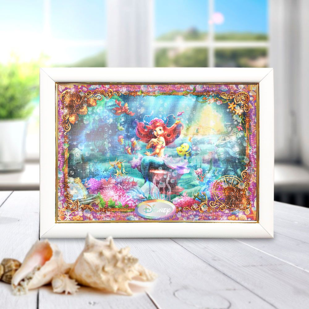 ここは、アリエルの暮らす海の中。陸にいるエリック王子にいつも想いを募らせています。恋するマーメイド、キラキラの美しいアリエル。絵柄のゴージャスな枠は、アンティークの家具、工芸品などに使われている海のモチーフをデザインした「ロカイユ装飾」というものです。パズル完成後は、別売の専用パネルに入れて飾れば、お部屋を彩るステキなインテリアに!