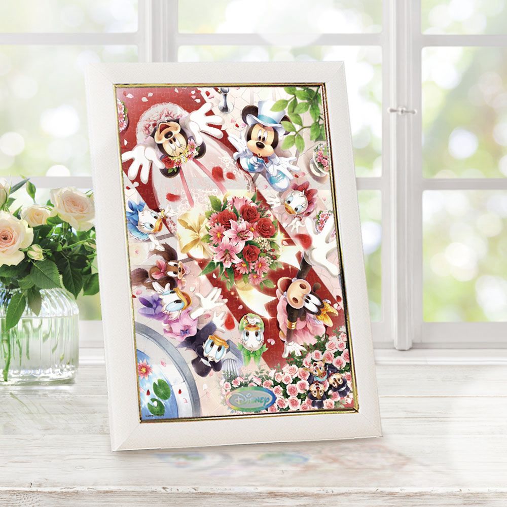 ミッキーとミニーの夢のウェディング。花嫁ミニーの手から高く舞い上がったブーケは、いったい誰の手に?!花嫁の幸せを誰かにつなぐハッピーなセレモニー。幸せが詰まった瞬間ですね。決まった向きがないので、タテでもヨコでも自由に飾れる、マルチアングルアートのジグソーパズルです。