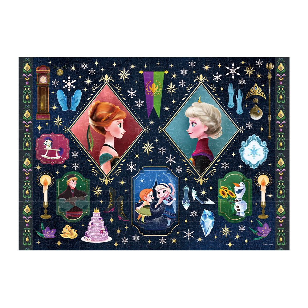 戴冠式のドレス姿のアナとエルサを中心に、幼い頃の二人やオラフ、クリストフの姿、