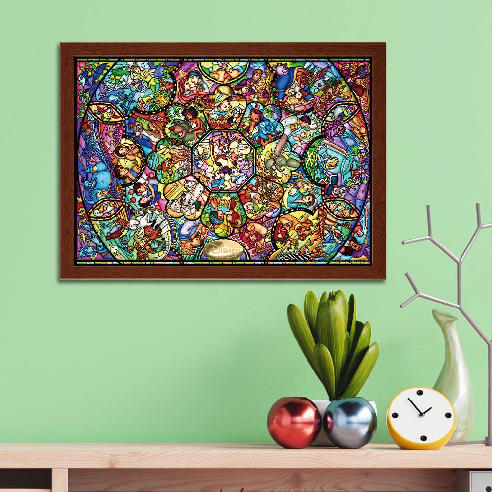 まるで、大聖堂の天井に飾られるステンドグラスを思わせる、とても豪華な絵柄です。 ディズニーアニメーション 31作品、107体のキャラクターで構成しています。 さらに、ユニークな特徴としてタテ・ヨコどの向きでも鑑賞することができる、その名も「マルチアングル・アート」なので、 お好きな向きで飾ることもできます。完成サイズがA3(29.7×42cm)なので、コンパクトなスペースで本格的な1000ピースのパズルが楽しめます。