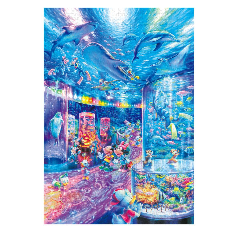 夜の水族館は昼間とは違う魅力がいっぱい!ライトアップされたクラゲ、奥の水槽のイワシの大群、 チューブでご機嫌なアザラシ、悠々と泳ぐ大きなジンベイザメなど見所満載です!! 光りを蓄えて、暗いところで光るこの光るジグソーパズルで、ミッキーたちといっしょに海の生き物のふしぎで美しい世界をお楽しみください。