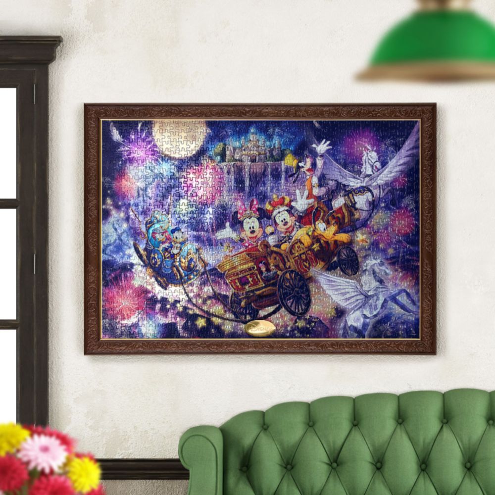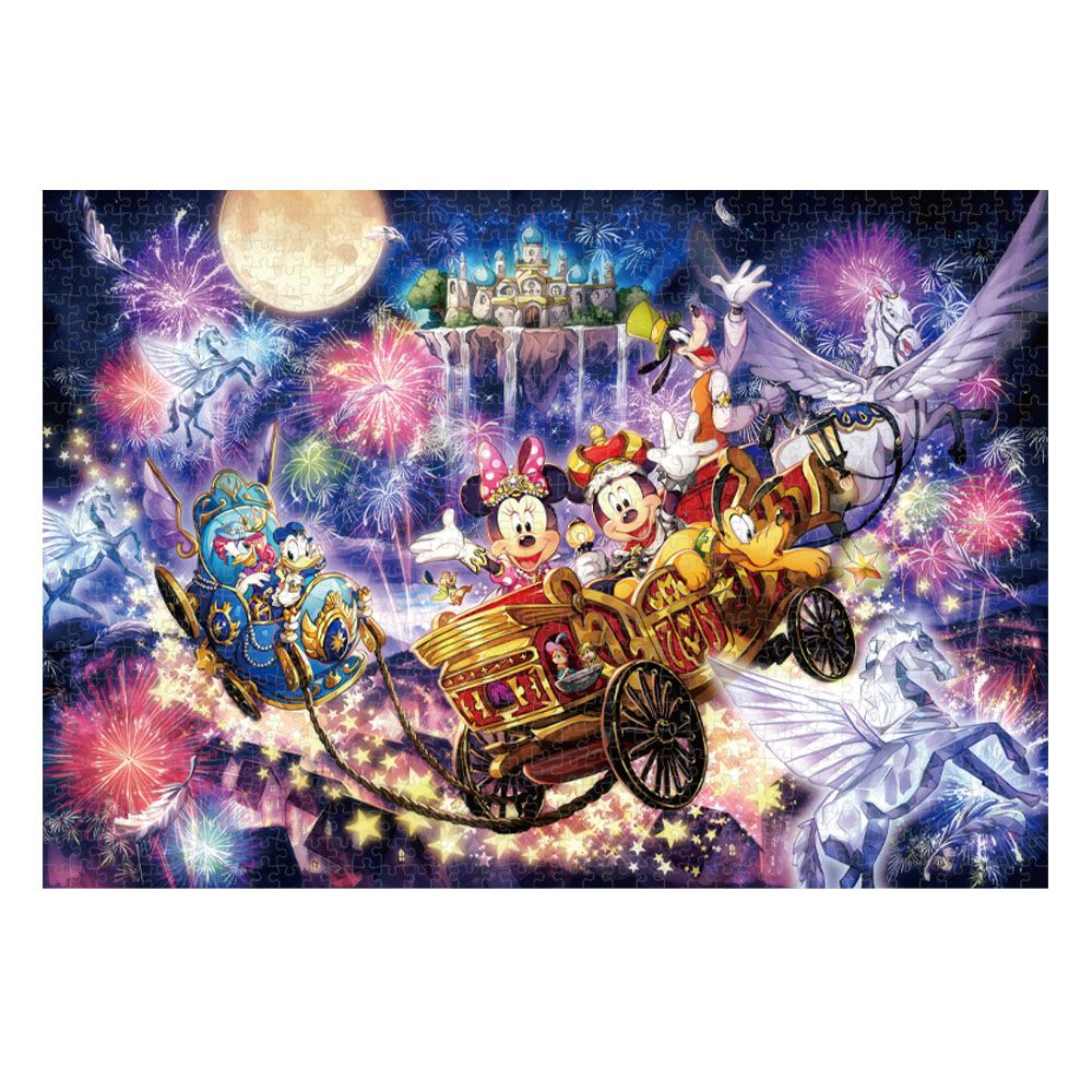 宙に浮かんだ魔法の王国が舞台。王様に扮したミッキーが、御者に扮したグーフィー率いる空飛ぶペガサスの馬車に乗って、ミニーや仲間たちと空中散歩を楽しんでいます。絵柄にぴったりの、キラキラきらめくホログラム仕様のジグソーパズルです。