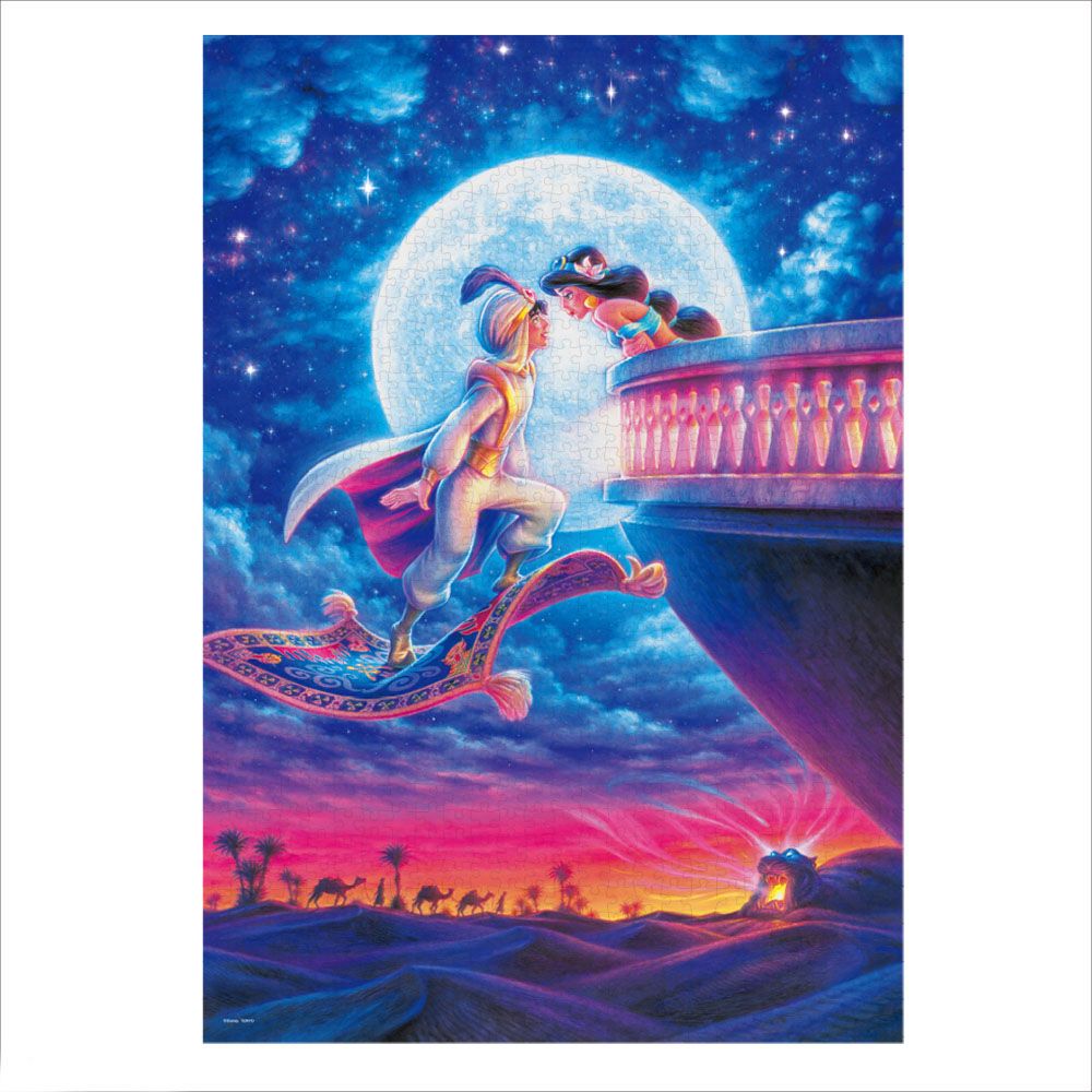 アラジンとジャスミンが魔法の絨毯に乗って、夜の世界をランデヴー。夢のようなひと時を終え、彼女を宮殿に送り届けます。「もっと一緒にいたい…」そんなお互いの思いが伝わってくる、なんともロマンチックな場面です。光を蓄えて暗闇で光るジグソーパズルなので、組んだあとお部屋に飾れば、月明かりに照らし出された二人の姿をさらにムーディーに楽しむことができます。