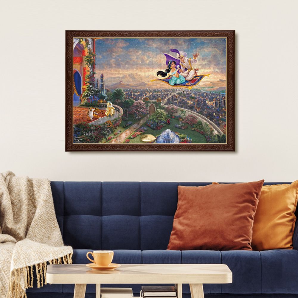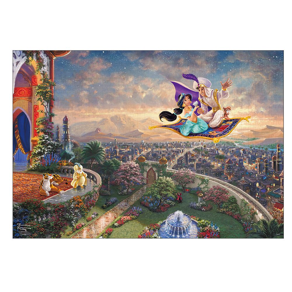 〈スペシャルアート・コレクション〉シリーズ、アーティスト/トーマス・キンケードが描く、「アラジン」の世界!米国では最も人気のあるアーティストの一人で、彼が描き出す世界はどれも平和と喜びにあふれ、温かく包み込むような光の表現が、見る人の心に感動と癒しを与えてくれます。このアートのタッチを生かすために、パズルの表面に凹凸をつけ、絵画で用いる「キャンバス」のような加工を施した〈キャンバス・スタイル〉でご用意しました。パズルの完成後は、別売の専用パネルに入れて飾ることで、お部屋をステキに彩るインテリアとしてもお楽しみいただけます!