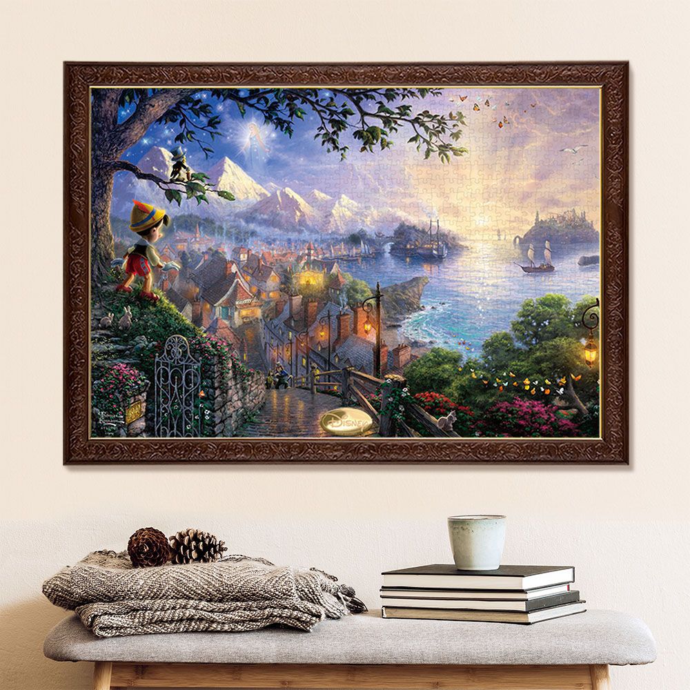 〈スペシャルアート コレクション〉シリーズ、トーマス・キンケード スタジオが描く「ピノキオ」の世界! 米国では最も人気のあるアーティストの一人で、彼とそのスタジオが描き出す世界はどれも平和と喜びにあふれ、温かく包み込むような光の表現が、見る人の心に感動と癒しを与えてくれます。このアートのタッチを生かすために、パズルの表面に凹凸をつけ、絵画で用いる「キャンバス」のような加工を施した〈キャンバス・スタイル〉でご用意しました。パズル完成後は、別売の専用パネルに入れて飾れば、お部屋を彩るステキなインテリアに!