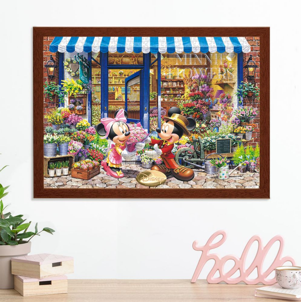 ミニーのお花屋さんがオープン!! 最初のお客様はもちろんミッキーです! 画面の中には、チューリップ、ユリ、ガーベラ、スプレーローズ、デルフィニウム……美しく描かれている花々の数は、なんと50種類以上!あなたは、幾つ花の名前を言えますか?完成サイズがA3(29.7×42cm)なので、コンパクトなスペースで本格的な1000ピースのパズルが楽しめます。パズル完成後は別売の専用パネルに入れて飾れば、お部屋を彩るステキなインテリアに!