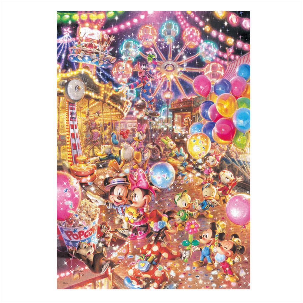 ここは、ノスタルジックな雰囲気の移動遊園地。占いカードを待つ、エイプリル、メイ、ジューン。風船をもらって嬉しそうな、ヒューイ、デューイ、ルーイ。マックスのバルーンアートを見て喜んでいるモーティー&フェルディ。みんな思い思いに楽しんでいますね。完成した後は、別売の専用パネルに入れて飾れば、お部屋の素敵なインテリアに!
