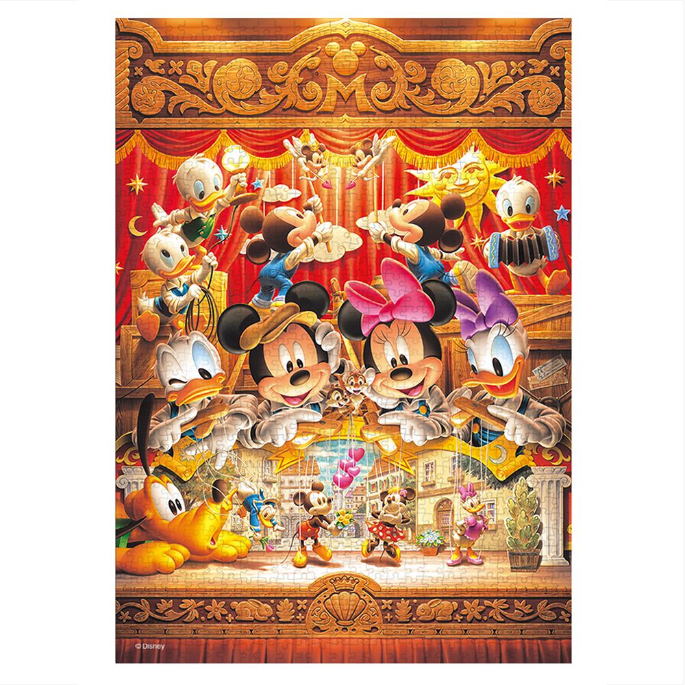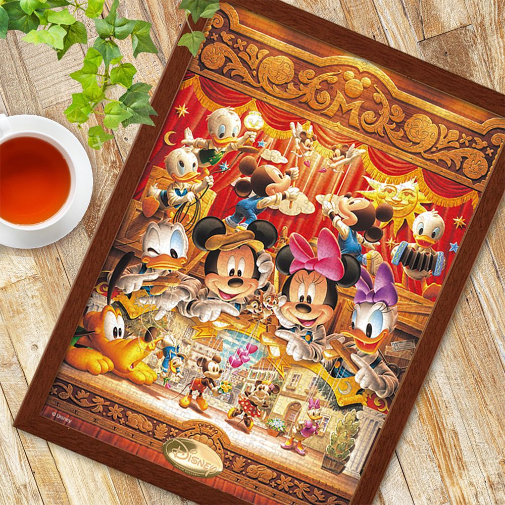 自分たちのパペットを作り、人形劇を演じているミッキーたち。甥っ子たちも照明、音楽、脇役でお手伝いをしています。でもよ〜く見てみると…。劇の中でミッキーは、ミニーに愛の告白中。ドナルドは待ち合わせに遅れてしまい、待ちくたびれてデイジーにすご〜く怒られています!!完成サイズがA3だから、小さな机の上でも遊べて、1000ピースなので本格的なジグソーパズルの達成感が味わえます。完成した後は、別売の専用パネルに入れて飾れば、お部屋の素敵なインテリアに!